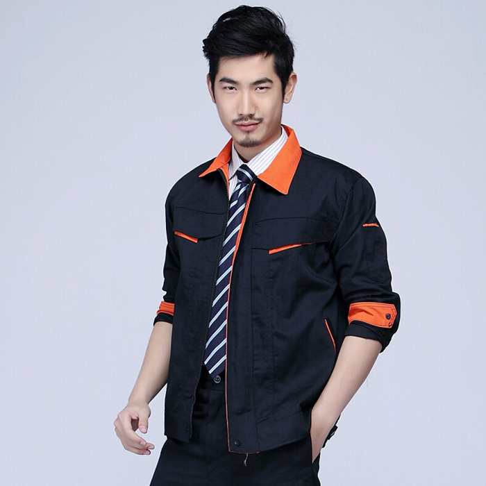 瑞發選擇的是JL-QD250款,此款以黑色為主色,胸前衣兜和筆袋采用橘色搭配,醒目,工業感強。前兜撞色拼接,走線細致,實用性強。左中腰間口袋均采用雙層設計,傾斜線條,穩重大氣,以顯示設計師配合我們需要的理念,這是滿意。